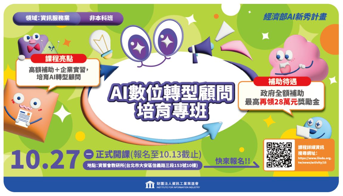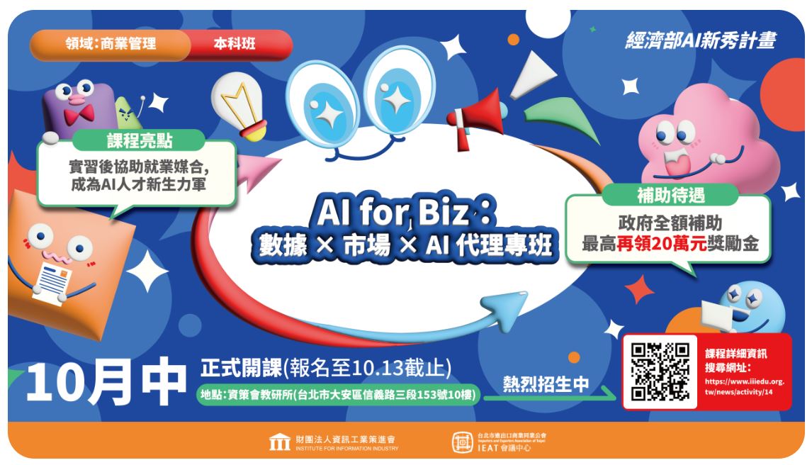 經濟部AI新秀計畫【AI 數位轉型顧問培育專班】【AI for Biz:數據 x 市場 x AI代理】延長報名期限至114年10月27日止,請符合資格且尚未就業之畢業生踴躍報名參加甄選